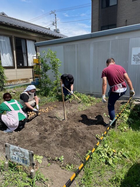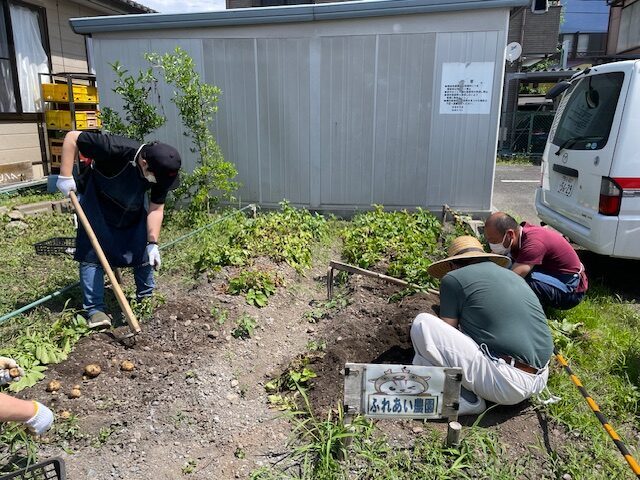 ふれあい作業所のみなさんでじゃがいもを掘りました。農園で愛情込めて育てたじゃがいもです。塩ゆでじゃがいもが一番おいしいと事務所でも話題になります。みなさんはどんなじゃがいも料理がお好きですか。暑い日が続きますがみなさん体調に注意しながらお過ごしください。